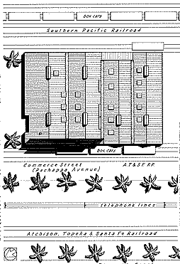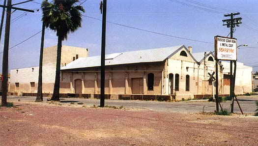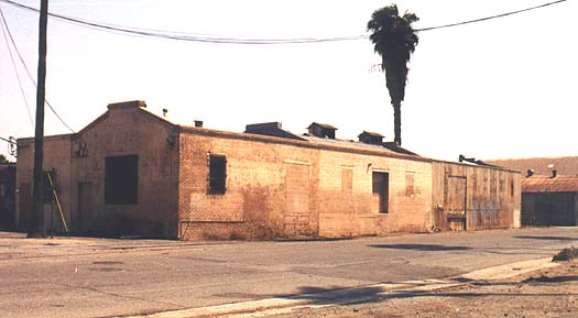 The National Orange Company Sunkist packing house, built in 1898, was said to be the oldest, continuously operating packing house in the US. The building was on the east side of Commerce Street at 6th Street and faced the Santa Fe main line through Riverside, about two blocks north of the station. Two Santa Fe sidings came along the east side of Commerce Street directly in front of the building, shown here as it appeared in 2000. ![]() James Lancaster Photo This next photo shows the structures on the immediate south side of the building shown in the previous photo (Photo-JL). The tan building on the left was also part of National Orange. The building on the right was at one time (1939) Westbrook Company, a furniture and hardware business. The rear of the packing house was served by the SP Riverside Branch. You can still see the tracks in the street (Photo-JL). This January 1975 photo by John Signor provides a slightly different view of the front of the National Orange packing house (Photo-JS). John Signor photo, used by permission. Unfortunately, the National Orange Company packing house was destroyed by fire in 2001. ![]() The Library of Congress Historic American Buildings Survey/Historic American Engineering Record (HABS/HAER) web site (see below), contains additional information about the National Orange Company packing house, including this color photo of the front of the building (Photo-HH). The following HABS/HAER elevation drawings show three sides of the building: (1) the west (front) side as it appeared in 1906 when it was known as the Rubidoux Fruit Company (Drawing-HH); (2) the west side as it appeared in 1991 (Drawing-HH); (3) the north side as it appeared in 1991 (Drawing-HH); and the east (back) side as it appeared in 1991 (Drawing-HH). The next drawing shows a plan view of the complex with the east (back) side of the packing house and five SP tracks at the top, and the west (front) side and two ATSF tracks at the bottom (Drawing-HH), followed by a plan view of the interior of the building complex (Drawing-HH), a larger plan view of the machinery in the packing house (Drawing-HH), and a description of the orange packing process (Text-HH). The color photo was taken in 1991 by Brian Grogan. The source of the elevation drawings is not identified but additional information about the National Orange Company packing house, including an extensive history and more color photos, is available from the Library of Congress HABS/HAER web site (National Orange Company Data Set). The HABS/HAER web site also contains a west-to-east cross section drawing from the Santa Fe depot to the National Orange packing house (Drawing-HH) as well as a plan view drawing of the commercial district around the National Orange packing house (Drawing-Large Version-HH) (Drawing-Small Version-HH). The drawings represent the year 1939. The source of the drawings is not specifically identified but additional information is available from the Library of Congress HABS/HAER web site (Arlington Heights Citrus Landscape Data Set). There were other interesting industrial buildings in Riverside along Commerce Street between 3rd and 7th Streets. The building across 6th street to the north was at one time Lerner's Riverside Grain Milling Company (Photo-JL). This building at 4th Street was at one time used for kerosene storage by Standard Oil (Photo-JL). All of the buildings were served by rail at one time.