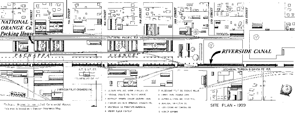 Historic Packing Houses and Other Industrial Structures in Southern California Virtual Tour of Riverside County: Riverside Copyright 2002 by James E. Lancaster, Ph.D. Notice:The images - photographs, drawings, maps and track diagrams - presented in this web site are the property of the respective contributors and may not be used for any purpose without permission. For more information see Photo Credits and Restrictions. The web site contains a large number of images. Some are displayed inline with the text. However, to control the loading time, the remaining images are viewed by clicking on the related link, e.g., ( Photo-JL), (Drawing-HH), etc. Please note that the images that open via these links appear in a separate web browser window.