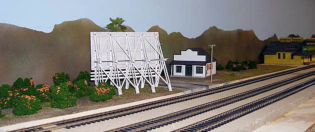 Jim also built his HO model of the Riverside, CA packing house from a YesterYear Models kit. He did not have enough depth for the complete model so he moved the back half to the right side of the front. The prototype also had two similar additional sheds on this side. ![]() Front of the packing house model. (James Crowell photo)