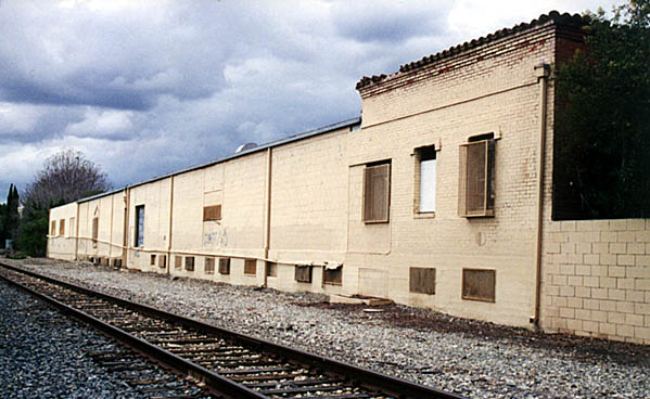 The photo below shows the north side of the main part of the packing house as it looks today (April 2003). ![]() The next view shows the NW end of the packing house, an obvious addition possibly constructed as a result of either the 1937 or 1942 building permits. ![]() Additional photos show the north side loading dock (Photo-JL) and the brick office building at the east end of the main structure (Photo-JL). This next photo shows the south side of the packing house looking west along the ex-Santa Fe track to Pasadena. ![]() At near the right is the south side of the brick office building. A close-up photo of the office shows the location of a former loading door, now filled in with concrete blocks and a window (Photo-JL). A final view looks west along the south side of the packing house (Photo-JL). In all, there were at least five loading doors that opened onto a Santa Fe siding that is long gone. I wish to thank Nora Corona Hernandez, Department of Urban and Regional Planning, Cal Poly University, Pomona CA, for alerting me about the existence of the packing house and providing the data on the building permits. Ms. Hernandez is working with the City of Duarte to possibly have the packing house designated as a historic building. If you have any additional information for the sixty year period since 1942, please feel free to contact me at ljames1@ix.netcom.com.