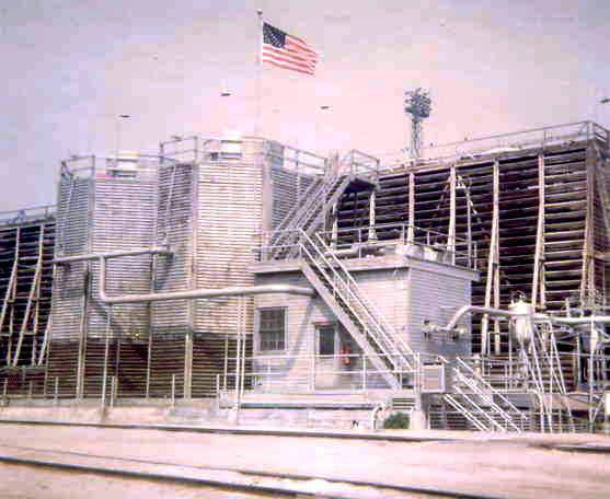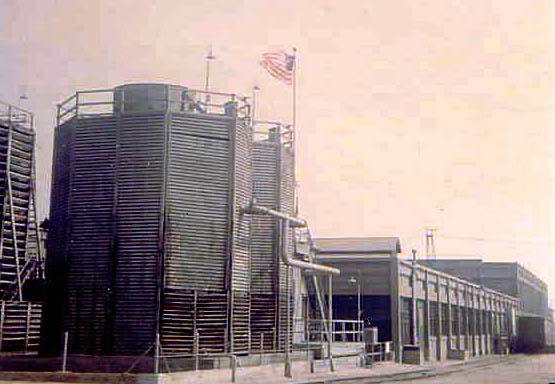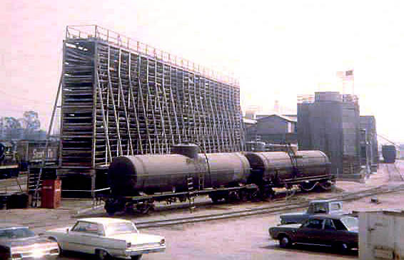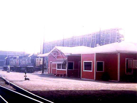 1. This photo, looking south in the B Yard, shows the north and east sides of the huge precooler building. There is an automatic icing machine in the far distant center. (PhotoLink-JT) 2. This photo is from the southwest edge of the B Yard, looking at the south and west sides of the building. The south side appears to have a black hole where the wooden icing sheds used to connect to it. The modern icing machine is to the right of the building. The diagonal line running down from the precooler roof appears to be a drainage pipe. (PhotoLink-JT) 3. This photo was taken from about the same location as photo 1, but looking southwest at the yard office and the wooden cooling tower. The north side of the precooler building is in the left background. (PhotoLink-JT) 4. This photo is from the northwest corner of B Yard, looking at the west side of the wooden cooling tower. There are a pair of rounded wooden towers (with flag on top) to the right of that, and the north side of the precooler building is in the background. (PhotoLink-JT) 5. This view shows the southwest side of the two rounded wooden towers with a flag on top, and the west side of the wooden cooling tower behind them. (PhotoLink-JT) 6. This is a view of the northwest sides of the rounded wooden towers and the long west side of the precooler building. (PhotoLink-JT) To tour other San Bernardino County cities, or other counties, return to the Virtual Tour of San Bernardino County Page. Return to the Historic Packing Houses and Other Industrial Structures in Southern California Home Page. Return to the Trains Page. |