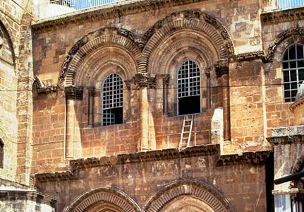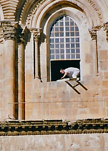 A law professor at a midwest university wrote me that an anonymous source in Jerusalem told him that the ladder has been there for decades and stays there because of the enforcement of the 'Status Quo' agreement at the Church. The source continued: "[The] problem stems from the fact that the two windows above belong to the Armenians and they have the right to clean and repair them, and the cornice on which the ladder rests belongs to the Greek Orthodox. At some point (last century) the Armenians put out the ladder for the purpose of doing work on the windows, [and] the Greeks protested that the ladder was resting on their portion. The Armenians refused to remove the ladder - hence the frozen reality."
