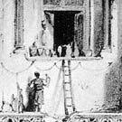The quote above from Cust in Fr. O'Connor's letter points out how the Armenians use the balcony where the ladder rests 'on the occasion of the festival ceremonies that take place in the Courtyard.' One such ceremony is the washing of the feet that occurs each year in conjunction with Easter. The undated photo below (left) and the enlarged view of the entrance (right) show the crowd filling the courtyard and occuping every cornice and balcony, including the one with the ladder, during the foot washing ceremony.