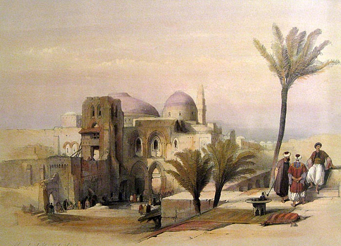 ![]() THE CHURCH AND THE LADDER: Copyright 1998, 1999, 2011, 2015 by James E. Lancaster, Ph.D. Note: This material, including the text and all images by the author or from the author's collection, may not be reproduced without permission. July 1996. For Christmas 1995 my wife gave me a weekly calendar called "The Jerusalem Calendar 1996, A Celebration Of 3,000 Years." Each week was accompanied by an illustration depicting a historic site in Jerusalem or an event in the city's past. Most were old paintings, drawings or maps. Opposite the first week of January was an 1862 watercolor of the entrance to the Church of the Holy Sepulchre by Carl Friedrich Heinrich Werner. When I showed it to a friend he asked about a small ladder just below one of the windows above the entrance. The ladder rests on a ledge that spans the arches above two doorways built by the Crusaders in the 12th century (the right hand doorway is sealed and has been that way for 800 years). I hadn't paid much attention to the ladder but his question aroused my curiosity. During visits to Jerusalem in 1990, 1992 and 19951 I had taken many photographs of the entrance to the Church of the Holy Sepulchre. Upon examination of my pictures I found the same small ladder in every single photo.