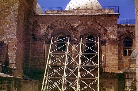 There seems to be a consensus on a couple of facts: (1) the ladder is there because of the Status Quo, and (2) the window belongs to the Armenians. However, there seemed to be some disagreement about who controls the balcony - Greeks or Armenians - and why the ladder is there, i.e., to clean the windows or give the Armenians access to the balcony? Or is there another, yet-to-be-discovered, totally different explanation? The next time you're in Jerusalem and visit the Church of the Holy Sepulchre look for the ladder. If it's still there you'll know the Status Quo is still in effect. Postcripts September 1998. In a 1998 book on churches in Jerusalem,5 Aviva Bar-Am told about the ladder in her section on the Church of the Holy Sepulchre. When describing the entrance to the church, she wrote, "Note the ladder under one of the second story windows. It was used over a century ago for hauling up food to Armenian monks locked in the church by the Turks. With the statu[s] quo still in force, the ladder seems destined to remain there forever!" April 1999. A photo of the Church of the Holy Sepulchre by R. Malcom Brown6 of the University of Texas showed the ladder and a change in the window above the ladder. A grate had been added to the window to keep people from reaching the ladder when the window is open. A prior incident where the ladder had been removed as a prank caused the installation of the grate.