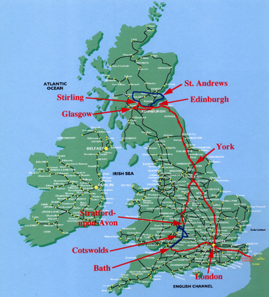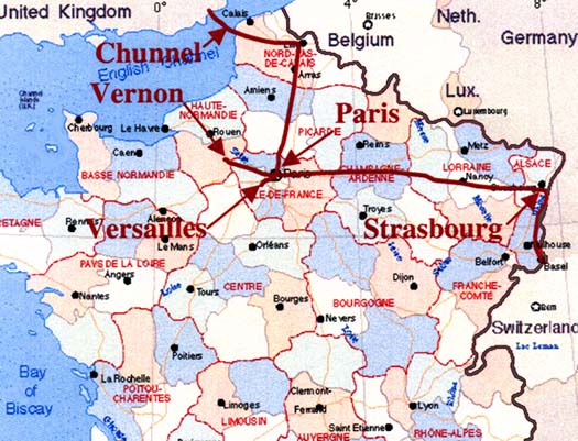 Maps of the UK, northern France, Switzerland and southern Germany show our route of travel in the UK and on the continent. The heavy red line indicates travel by train and the heavy blue line travel by rental car.