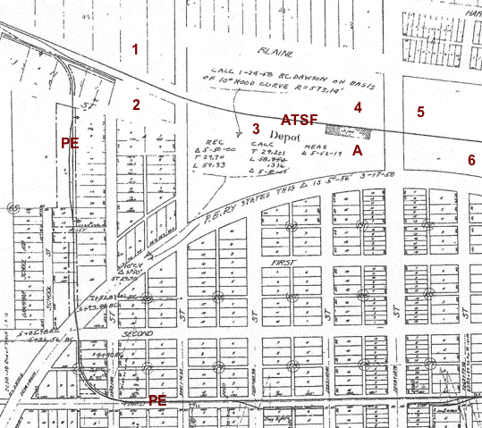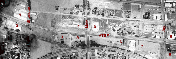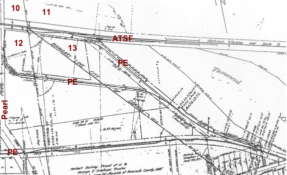 The Santa Fe built a large frame depot in Corona in 1906 to serve the growing town and industries. This depot was replaced by a modern stucco depot in 1937. It remained in service for 50 years until it was closed in the late 1980s. The Pacific Electric Railway operated a line from Riverside through Arlington to Corona, where it ran west on 3rd St. to Merrill. The section from Arlington to Corona was placed in service in February 1915. PE maps show three spurs for freight service that terminated next to the Santa Fe tracks in the packing house area. The PE was eventually merged into parent Southern Pacific and the line into Corona was abandoned by the SP in June of 1973. The PE Corona depot was on Third Street. Corona packing house and industry locations along the Santa Fe west of Pearl Street are identified by numbers in Figure 2. Some of these locations are also indicated in Figure 3 and additional packing house locations east of Pearl Street are identified in Figure 4. The Santa Fe station is at location A in Figures 2 and 3.
