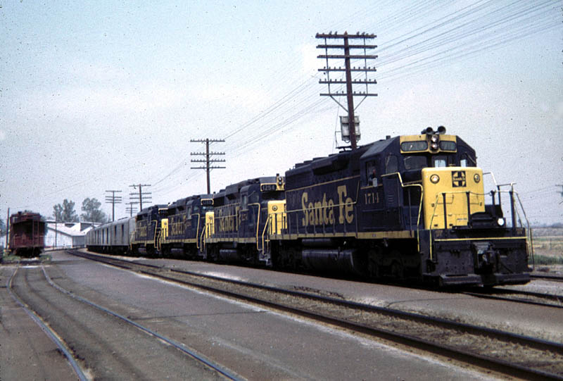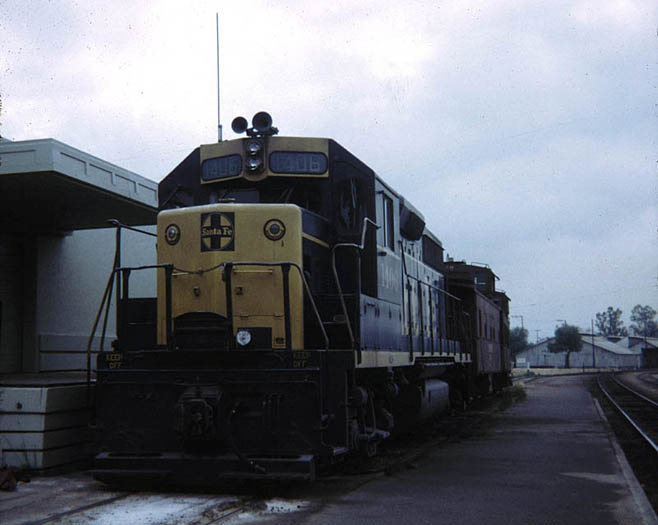 The Call Fruit Co. packing house was expanded within a few years with additions of lemon curing and packing space. By 1928 it had been renamed the A. F. Call Estates Orange & Lemon packing house and continued in operation through the 1940s. Both the Santa Fe and the PE served this location. 1911 By 1911 one additional packing house shows up east of Main St. and south of the ATSF main line but without a name or railroad spur so it may have been under construction (Location 6). By 1928 it was identified as the Sparr Fruit Co. The 1942 Sanborn map shows a fertilizer storage building at the same location. A building on the same site is shown in Figure 7 at the right behind the Santa Fe reefer. The photo also shows the eastbound Grand Canyon leaving Corona in April 1968, shortly before the train lost its name and was switched to the Santa Fe’s second district line via Pasadena.