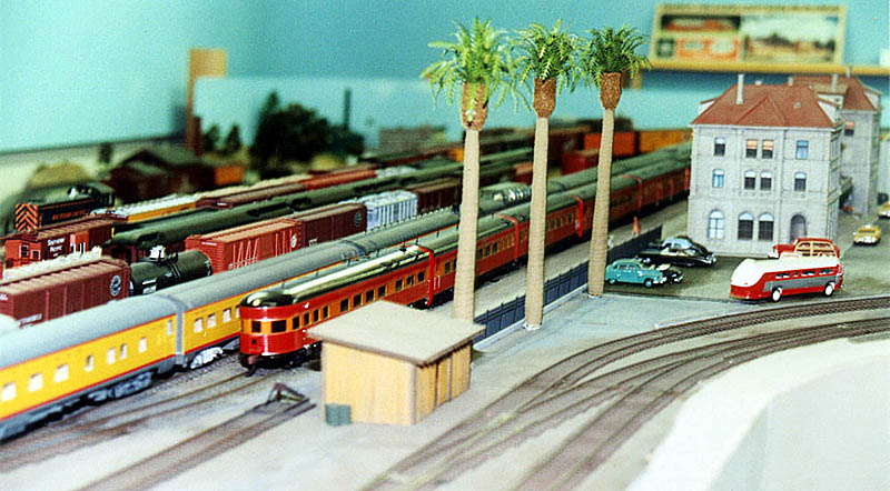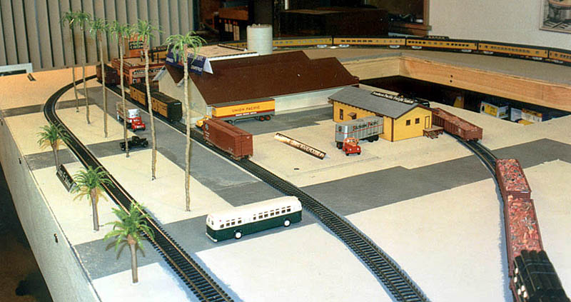 The new Riverside extension from the north looking southeast. The code 100 trackwork is temporary and was installed to provide a continuous loop (the mainline currently curves back to Corona) during the September 2005 NMRA-PSR layout tour. The final track plan will be similar but there will be additional sidings, the track will be code 83 and the main line will continue up a 2% grade along the back of the layout to an upper deck. |