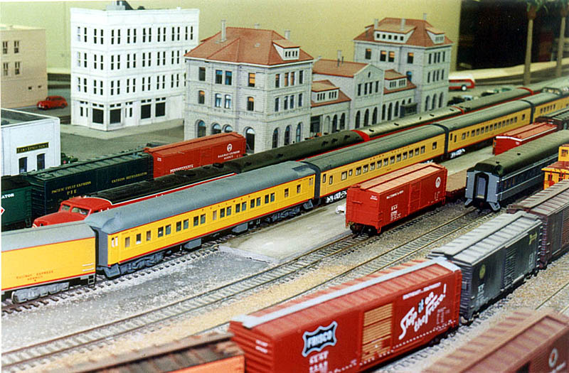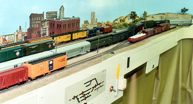 The baggage-chair-rider car passes the Chapman station. Compare these two photos of the Fast Mail with the first four photos in the original photo section above. Note that the lower level backdrop has been moved back about four inches to allow for shallow structures to be placed between the rearmost Chapman siding and the backdrop.