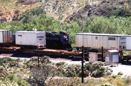 Just downhill from Cajon, a westbound intermodal train blocked most of the view of the steam engine.