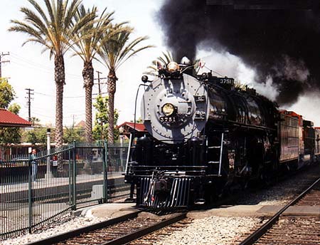 The 4-8-4 roars through Fullerton on the middle track at about 50 mph.