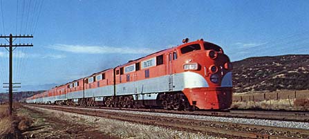 ![]() This photo of the mostly streamlined Golden State Limited, in its original red and silver color scheme, was taken by Frank Peterson and published in the "Southern Pacific Review, 1952-82," by Joseph A. Strapac, Shade Tree Books, September, 1983, page 19. The photo is used here by permission from the author.