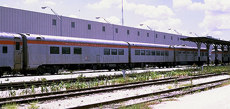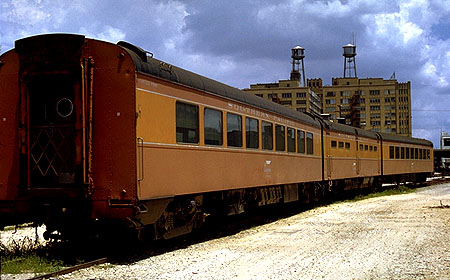In the late 1960s Judge Roy Hofeinz, owner of the Houston Astros baseball team, began buying retired passenger cars for a railroad theme motel (that was never built). Most of the cars were sleepers and official cars from the SP and the Southern and were stored on tracks at the SP station in Houston. He also bought two SP triple unit cars. I photographed all of the cars in August, 1970. Many were in poor shape. Shown here are an ex-Lark Club and an ex-Shasta Daylight triple unit diner.