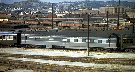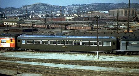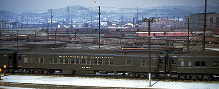 3. "American Flyer" chair car SSW 200. This car became SP 2702 in July, 1954, then SP 2350 in October 1954. In the late 1950s it was assigned to the Owl and painted two-tone gray. (Close-up View) Photos 2 and 3 are of cars in the same train. It has just come through the car washer. Note the Pacific Electric express cars in the background of both photos.