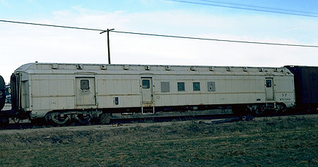 5. An 80-foot, ex-baggage-horse car from a group of cars built in 1936-37. Some cars from this class were rebuilt with modernized doors with large, single windows. Three cars were rebuilt into baggage-mail cars (see Photo #3).
