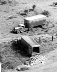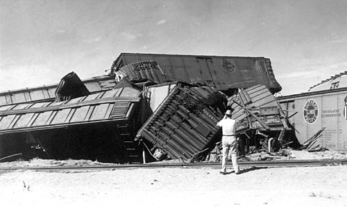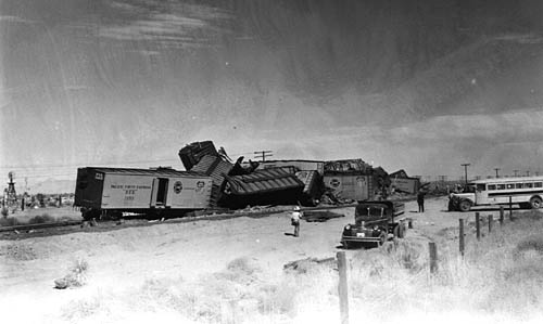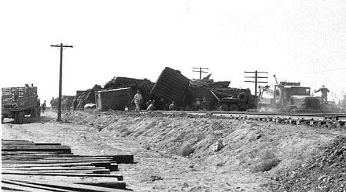 Copyright 2004 by James E. Lancaster My uncle, Ralph Wilson (1912-1958), was a professional photographer and lived in Deming, New Mexico in the late 1940s. These photos of an SP freight train wreck were in his collection when he passed away. The exact date and location are unknown but the vehicles indicate the late '40s and the location appears to be somewhere along the Sunset-Golden State Route. ![]() There are at least 25 wrecked freight cars in this aerial view. Most appear to be PFE wood and steel reefers. There is also at least one Fruit Growers Express wood reefer and an Atlantic Coast Line 50-foot automobile box car. Note that a shoo-fly has already been built around the wreck site. The scene is classic 1940s. Look at the motor court in the lower right corner. Here's a close-up of the Sundown Court Cabins with gas station and an adjacent Cafe. ![]() They look like they'd be perfectly at home in an old Alfred Hitchcock movie. Next is a close-up of the highway with the parked Bekins moving van. ![]() Note the SP sedan in Daylight colors across the highway from the moving van and the black 1930s-era automobile with the load on the roof. Is someone headed for California? Finally, here's a close-up of the two SP tractor-trailer rigs parked nearby. ![]() ![]() This is a closer, ground-level view of the wreck. This is the left end of the wreck in the aerial view. ![]() This is a view of the wreck from across the highway. ![]() Another photographer appears to be getting a close-up photo. ![]() The wood FGEX reefer number 36081 is in the center of this photo. Note the SP pickup truck. ![]() This view shows the ACL auto-box car. This is the right end of the wreck in the aerial view. ![]() The final view shows railroad crews at work cleaning up the mess. If anyone can identify the location of these photos please contact me at LJAMES1@ix.netcom.com.