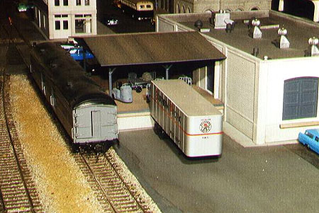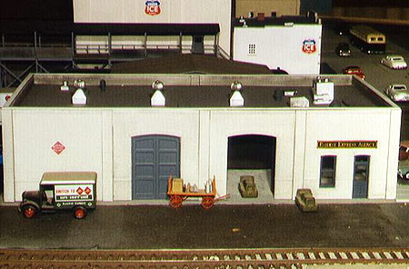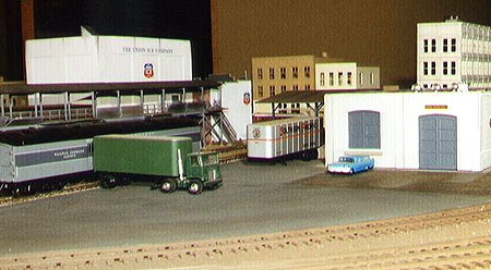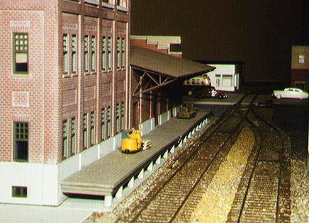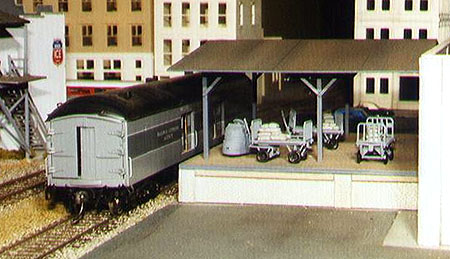An overhead view of the loading dock used by the Post Office for rail-truck transfer. The dock walls are built from Design Preservation modular sections. The roof is scratchbuilt.