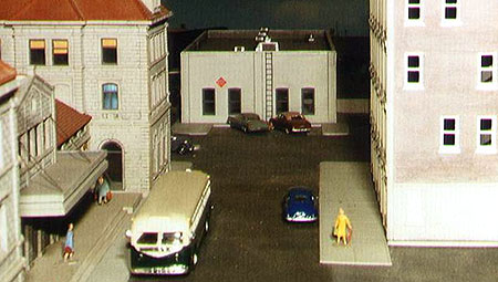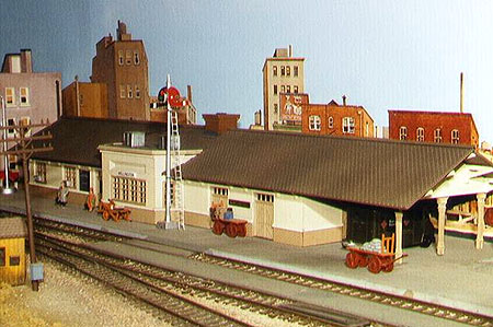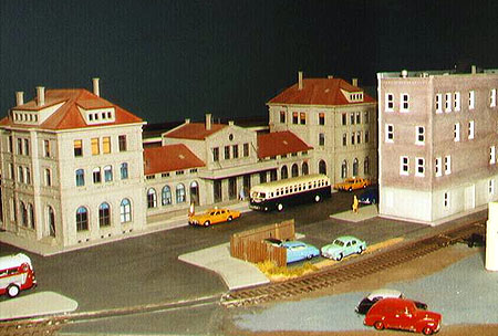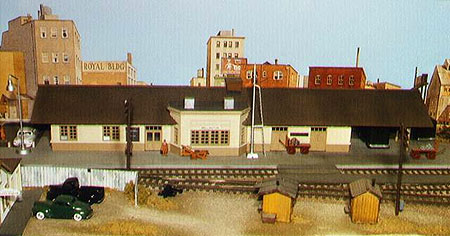 The Corona station is a modified and repainted Kibri Calw station. The track in the foreground leads to the Post Office loading dock. [In reality Corona has only a Santa Fe station but on the LA&SD the station serves three railroads.]