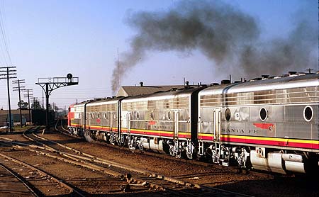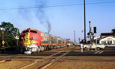 ![]() A heavy northbound San Diegan stops at Santa Ana on a weekend afternoon in July 1970. This was the last summer of operation as Santa Fe trains - Amtrak was less than a year away.