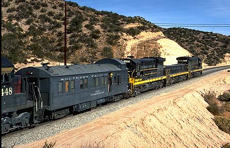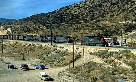 1. Railfans gather as a westbound freight passes the Hiland station, an ex-caboose, on the Palmdale Cutoff. What's going on?