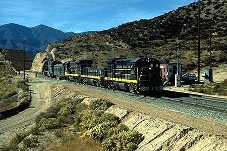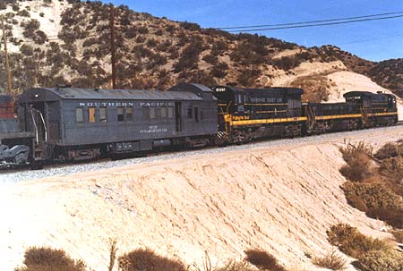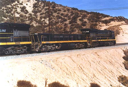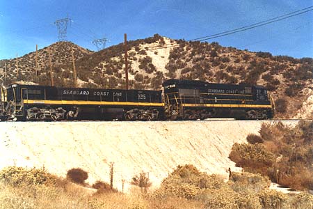 3. Now we see what attracted the railfans. These Seaboard Coast Line U-36Bs, spliced by a "More Axles for Tractive Effort" (MATE) road slug, had been the rear end helpers on the previous freight. SCL 1851, 3215 and 1855 tested on the SP for about two months in late 1977 and early 1978.