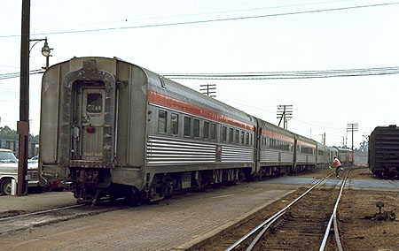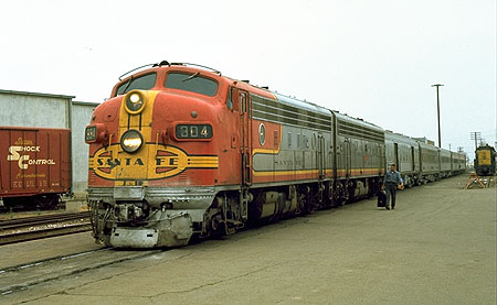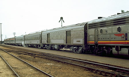 2. The consist was a mixture of Santa Fe and Southern Pacific equipment. The car behind the baggage car is a Santa Fe lounge.